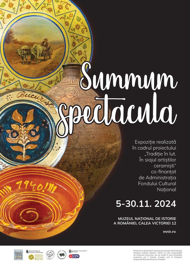 Muzeul Național de Istorie a României (MNIR) anunță deschiderea expoziției „Summum spectacula”, printre activitățile realizate în cadrul proiectului cultural „Tradiție în lut – În siajul artiștilor ceramiști”, cofinanțat de Administrația Fondului Cultural Național (AFCN), sesiunea de finanțare I/2024, aria Patrimoniu Cultural Material, cu suma de 127.382,80 lei.