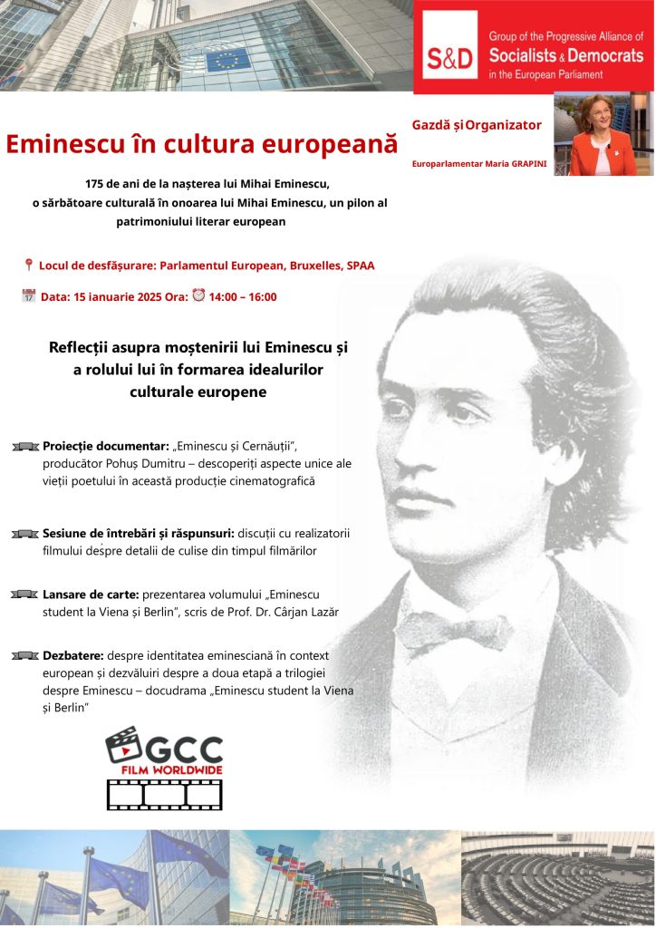 În cadrul evenimentului – un act cultural semnificativ, dedicat promovării culturii românești-organizat la Bruxelles, de eurodeputatul Grapini, în colaborare cu Pohus Dumitru, producătorul filmului documentar “Eminescu și Cernăuții” va fi prezentat, în premieră, acest film, fiind lansată, totodată, cartea “Eminescu, student la Viena și Berlin”, autor prof. univ. dr. Lazăr Cârjan.