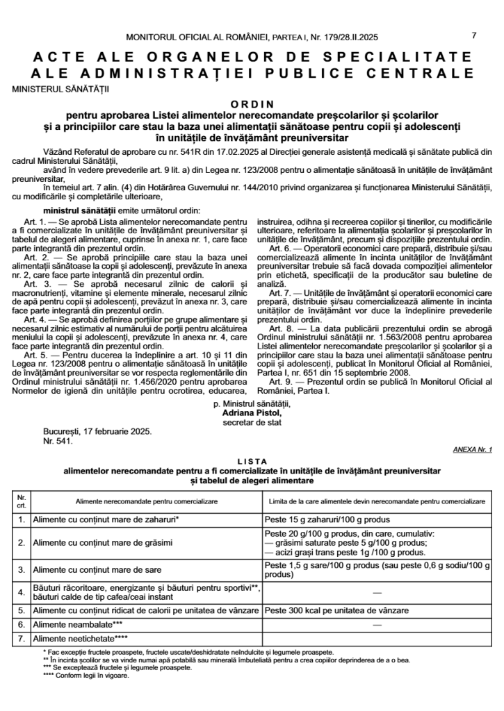 DOCUMENT Ordinul cu lista alimentelor nerecomandate preșcolarilor și școlarilor: