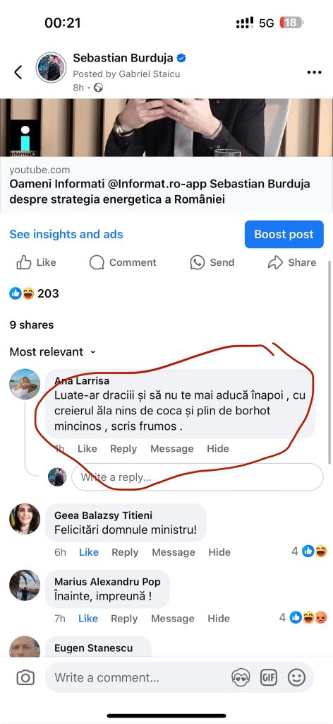 “Lupta se duce mai ales pe rețelele sociale. Legiuni de troli sunt activate și “trimise în luptă”. Conturi false, cu poze cu floricele, pisici sau copii nevinovați, cărora li se fură identitatea. Comentarii prestabilite, pline de injurii și minciuni. Zero responsabilitate, zero sancțiuni. Totul este permis. Aveți câteva mostre în pozele anexate. Liniile de mesaj sunt clare și simple: nimic nu e bine în România și cu România. Totul instigă la ură și violență. Călăreții fără cap sunt ridicați la rang de zei, de care nimeni nu are voie să se atingă. Toți politicienii fură, nimeni nu vrea binele țării, în afara unor salvatori dubioși!”, a punctat ministrul Energiei.