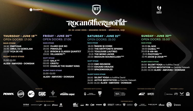 Rocanotherworld, festivalul care aduce oamenii împreună prin puterea valorilor comune, ia startul ediției cu numărul #10 în perioada 19–22 iunie 2025, în panoramica locație de la Gramma Wines – Bârnova, Iași. Reuniți de cele trei valori care ghidează festivalul, #becurious, #bedifferent și #beforothers, participanții sunt așteptați să se bucure de concerte live, DJ sets, activități recreative și educative, silent disco, sesiuni de yoga și meditație, o serie de dialoguri pe teme contemporane și multe alte activități conexe. Rocanotherworld este mai mult decât un festival de muzică – e un spațiu creativ, educativ și incluziv, inspirat de ideea de comunitate și responsabilitate socială.