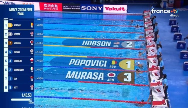 David Popovici (20 ani) a câștigat, marţi, 29 iulie 2029, medalia de aur în proba de 200 de metri liber de la Campionatele Mondiale de natație organizate în Singapore, cu timpul de 1:43,54.