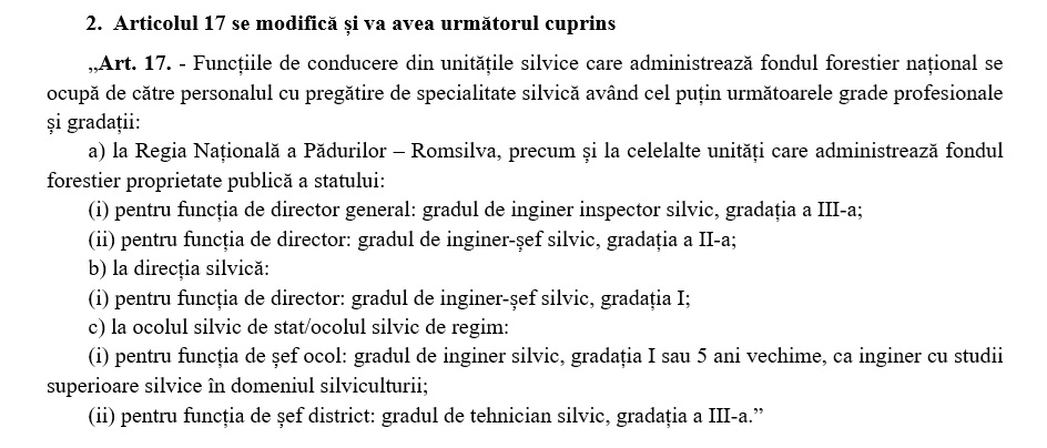 Un exemplu de modificare care nu are nicio justificare în nota de fundamentare este, atenție, scăderea considerabilă a vechimii în profesie, transpusă în grad profesional minim pentru ocuparea funcțiilor de conducere (director general, de la 21 la doar 13 ani vechime; director in regie, de la 17 ani, la doar 9 ani vechime; director directie silvică, de la 13 la 11 ani vechime).