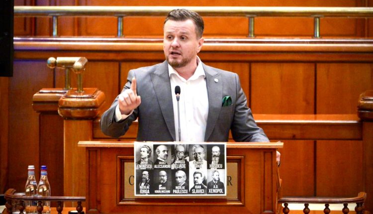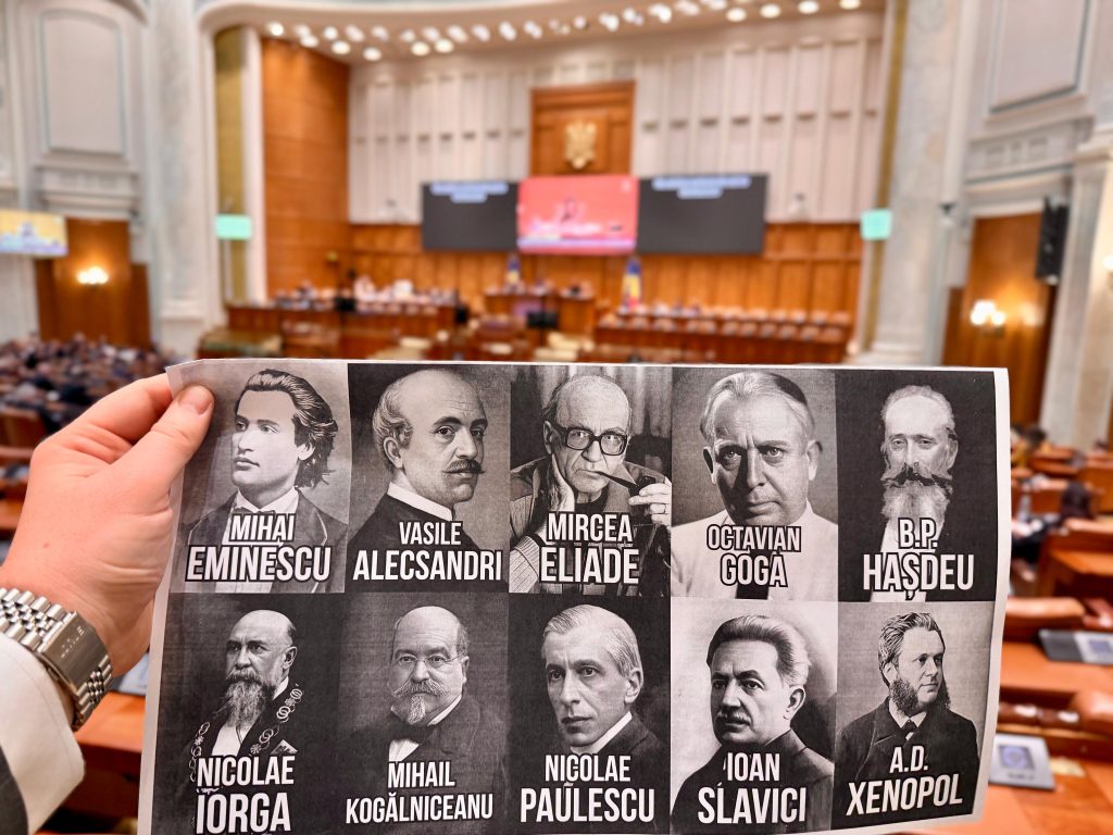 Deputatul Robert Alecu, neafiliat, a urcat la microfon cu un afiș lipit pe pupitru. Pe el, o selecție de nume fundamentale pentru cultura română: scriitori, istorici, oameni de știință. Fără simboluri. Fără sloganuri. Doar nume.