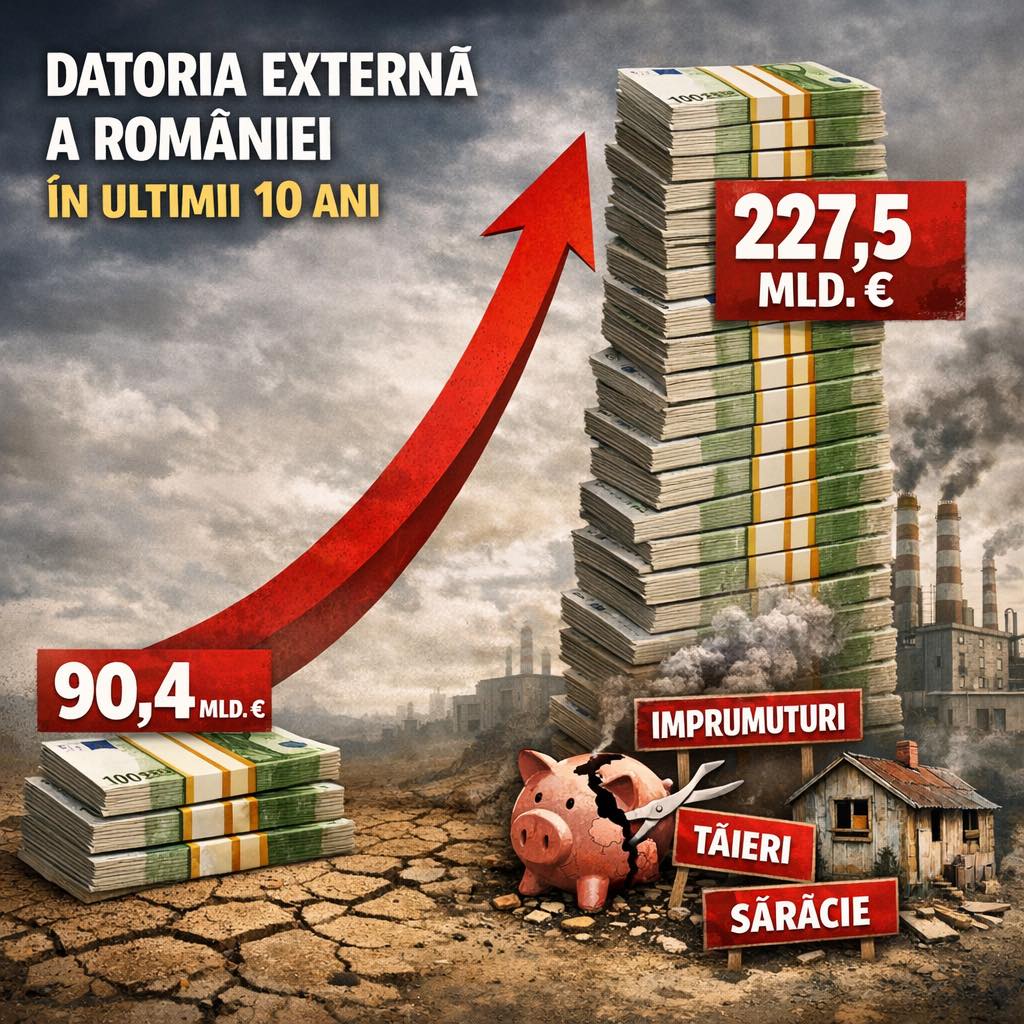 Potrivit lui Robert Alecu, în ultimii 10 ani, datoria externă a României a crescut de la 90,4 miliarde de euro la 227,5 miliarde de euro. O evoluție care ridică, în opinia acestuia, o întrebare legitimă: ce am construit, concret, în schimbul acestor împrumuturi?
