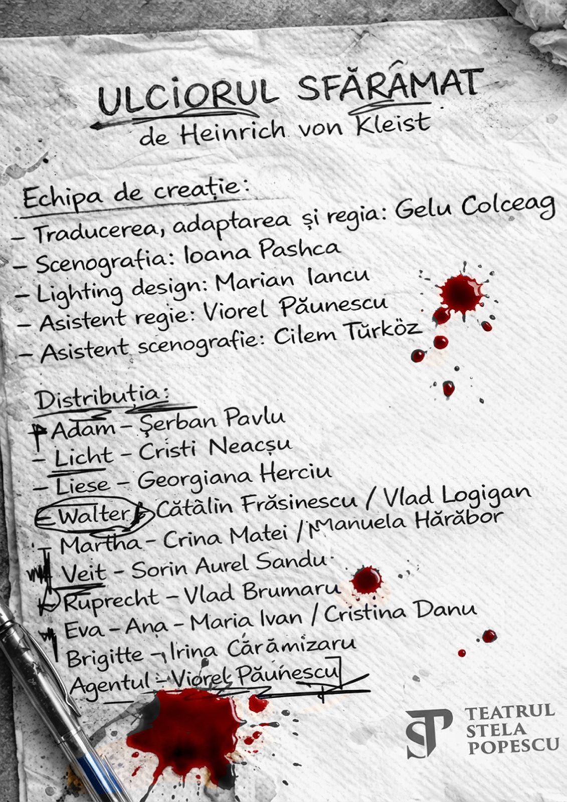 În regia lui Gelu Colceag şi scenografia Ioanei Pashca, spectacolul îi are în distribuţie pe Șerban Pavlu, Cristi Neacșu, Cătălin Frăsinescu/Vlad Logigan, Georgiana Herciu, Crina Matei/Manuela Hărăbor, Vlad Brumaru, Sorin Aurel Sandu, Ana-Maria Ivan/Cristina Danu, Irina Cărămizaru, Viorel Păunescu.
