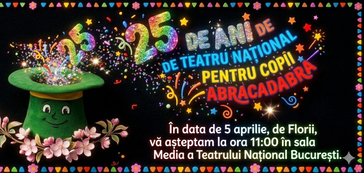 Spectacolul aniversar al Teatrului Naţional pentru copii Abracadabra va avea loc pe 5 aprilie 2026, de la ora 11.oo, în Sala Media. Dar toată luna aprilie, şi începând chiar din ultima duminică a lunii martie, copiii vor fi invitaţi la aniversarea Teatrului Naţional pentru Copii Abracadabra. Spiritul sărbătorii va fi prezent în fiecare din aceste spectacole.