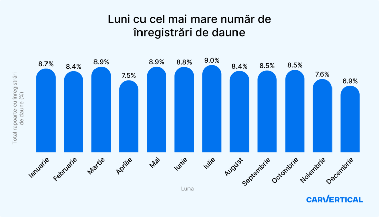 Studiul carVertical a analizat rapoartele care prezintă istoricul vehiculelor achiziționate de utilizatorii companiei între 2018 și 2024. Înregistrările de daune din rapoarte au fost sortate pe lunile anului, convertite în procente și s-a întocmit un clasament.