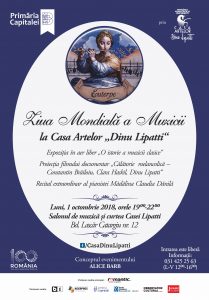 Pentru a duce la un alt nivel această sărbătoare alături de iubitorii muzicii clasice, Casa Artelor “Dinu Lipatti” decretează luna octombrie – Luna Muzicii Clasice! La sediul din Bd. Lascăr Catargiu, nr. 12, vor fi organizate săptămânal, pe tot parcursul lunii octombrie. Prin recitaluri, concerte, conferințe, întâlniri cu artişti, expoziţii și proiecții de filme vom celebra muzica românească și muzicienii români.