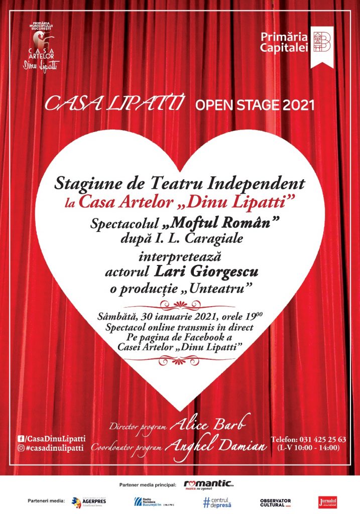 Casa Artelor „Dinu Lipatti” continuă în acest an Programul CASA LIPATTI Open Stage lansând, în premieră, Stagiunea de Teatru Independent dedicată tuturor artiștilor independenți, sâmbătă – 30 ianuarie 2021 – de la orele 19:00, cu Spectacolul „Moftul român” după I. L. Caragiale, în interpretarea actorului Lari Giorgescu – o producție „Unteatru”, care va fi transmisă în direct din Saloanele Casei Lipatti, pe pagina noastră de Facebook.