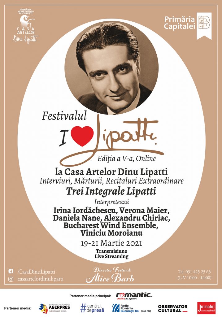 Casa Artelor Dinu Lipatti vă invită în perioada 19-21 martie 2021 la cea de-a V-a Ediție a Festivalului „I love Lipatti”, Ediție Online dedicată împlinirii a 104 ani de la nașterea compozitorului și celui mai mare pianist român al tuturor timpurilor, Dinu Lipatti (19 martie 1917 – 2 decembrie 1950), precum și aniversării a trei ani de la inaugurarea Centrului Cultural Casa Artelor Dinu Lipatti.